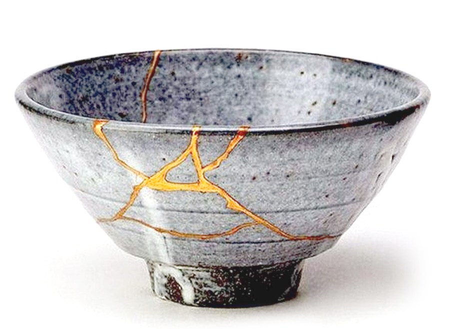 The best way to visualize this idea is with Kintsugi or Kintsukuroi. It is the centuries-old Japanese art of fixing broken pottery. Rather than glue broken ceramic pieces back together, the Kintsugi technique employs a special lacquer dusted with powdered gold or silver. The result is ceramic ware with seams of gold. The bowl or vase is repaired and more beautiful at the same time.