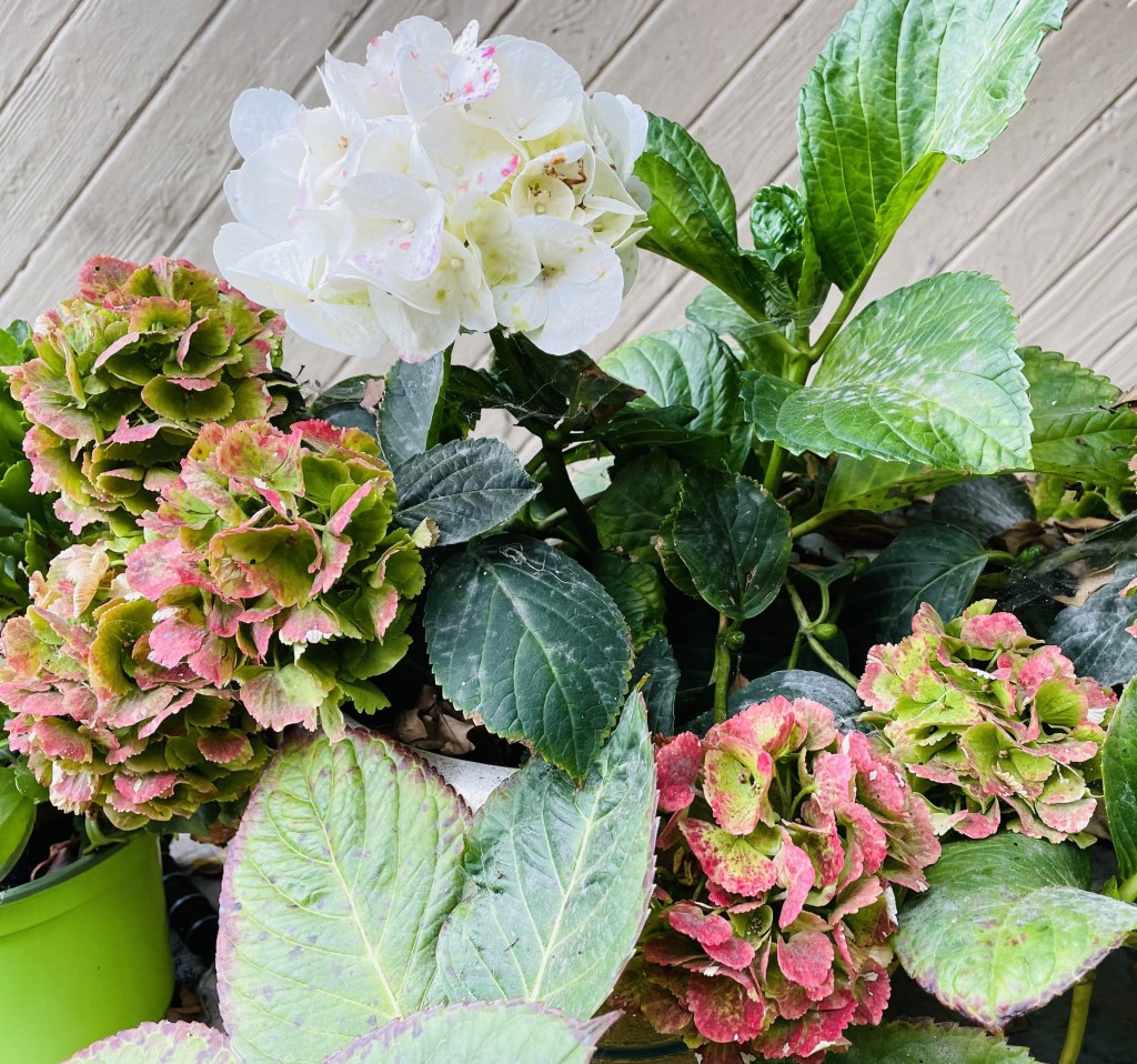 My hydrangeas have lost their summer brightness and are now various shades of mauve, dusty rose and green. A friend in Ohio shared a photo of an amazing bouquet of hydrangea blossoms from her garden. It looked like something out of a magazine.