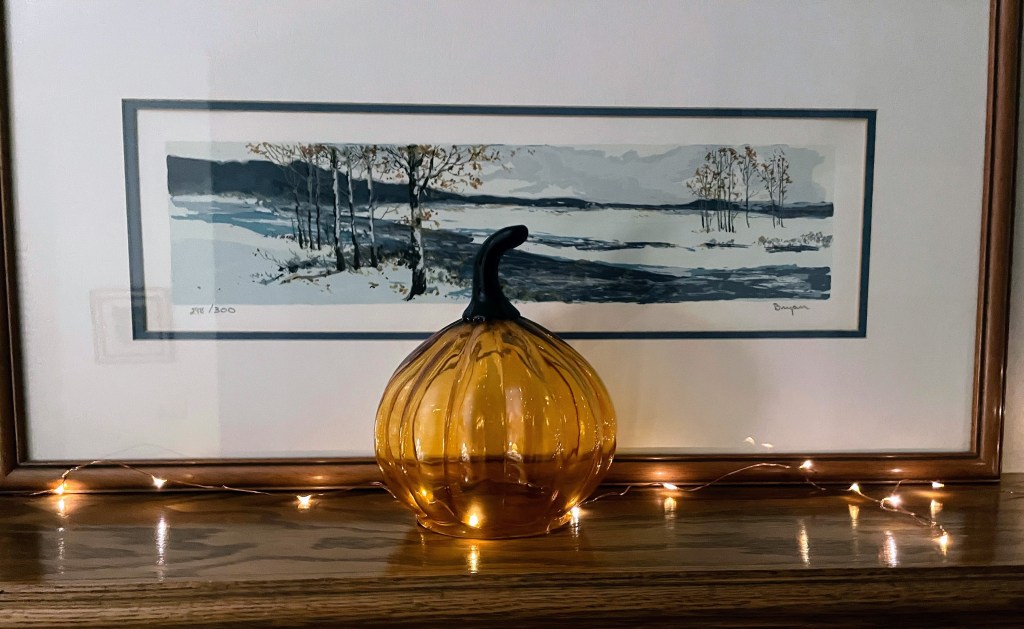 At the end of September, I gave into the urge to buy a graceful glass pumpkin. Anyone who knows me, knows that I work hard to wait until October to begin bingeing pumpkins. Pumpkins tend to follow me home all through the season and hang around for months. I offer a home for wayward pumpkins.